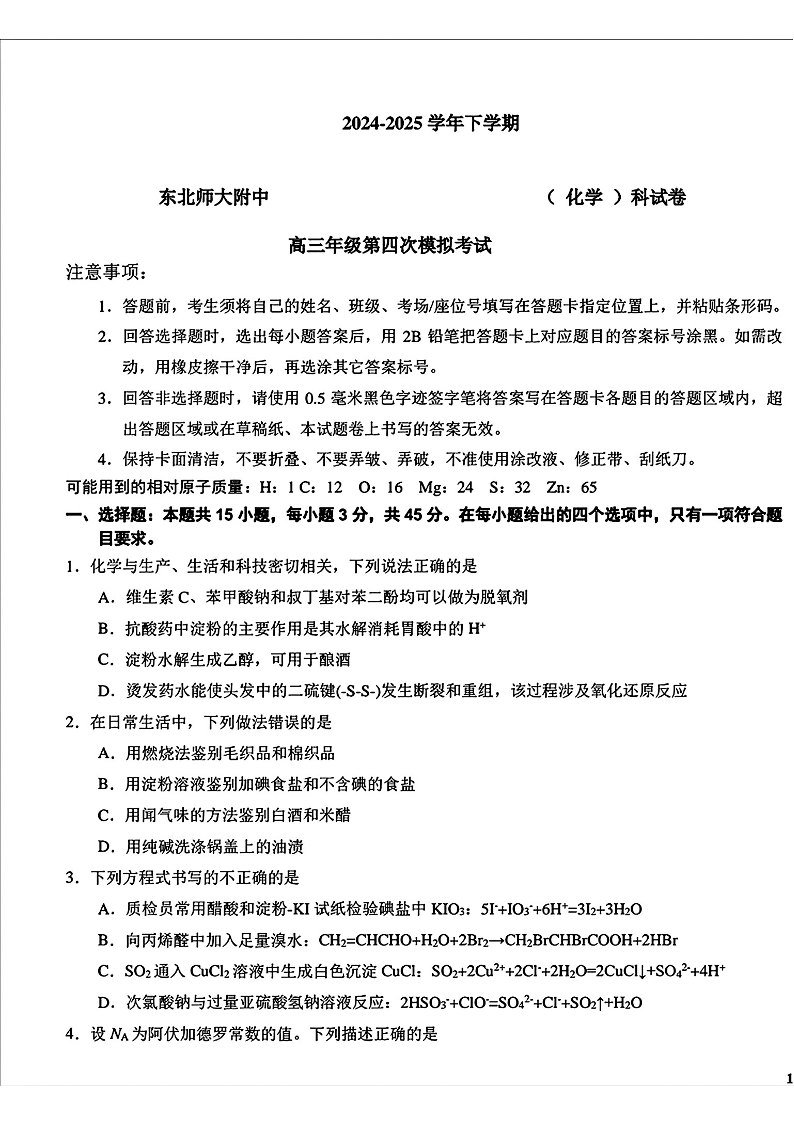 东北师大附中2025届高三年级第四次模拟考试 化学(含答案).pdf