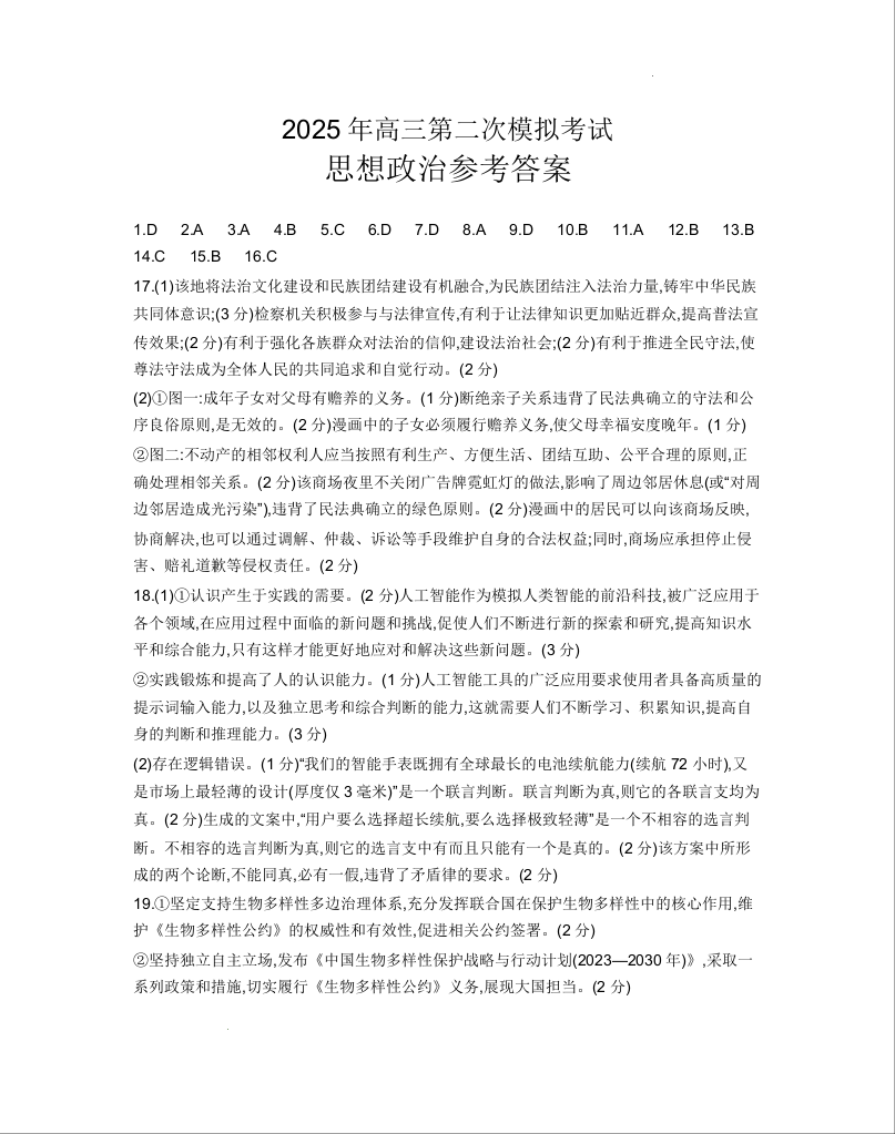 保定市2025年高三第二次模拟考试 政治答案.docx