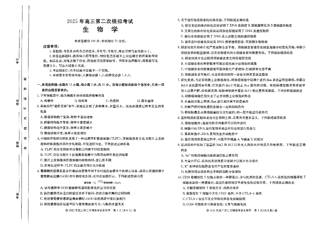 保定市2025年高三第二次模拟考试 生物.pdf