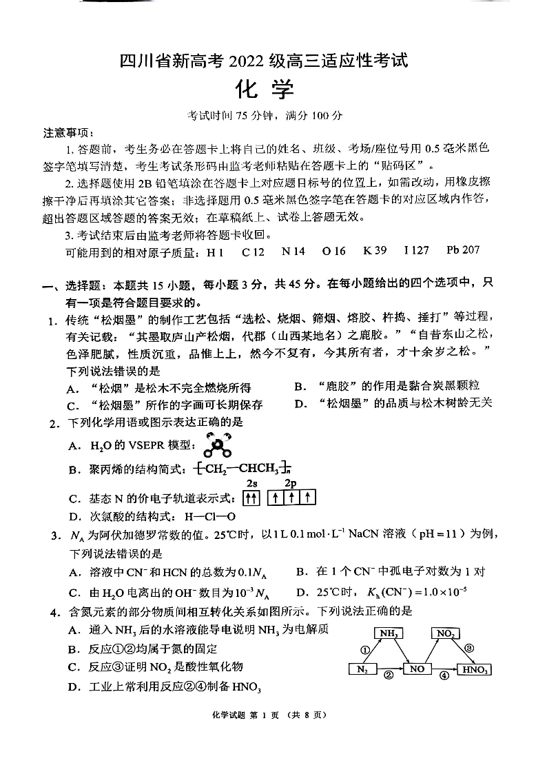四川省(蓉城名校联盟)新高考2022级高三适应性考试 化学.pdf
