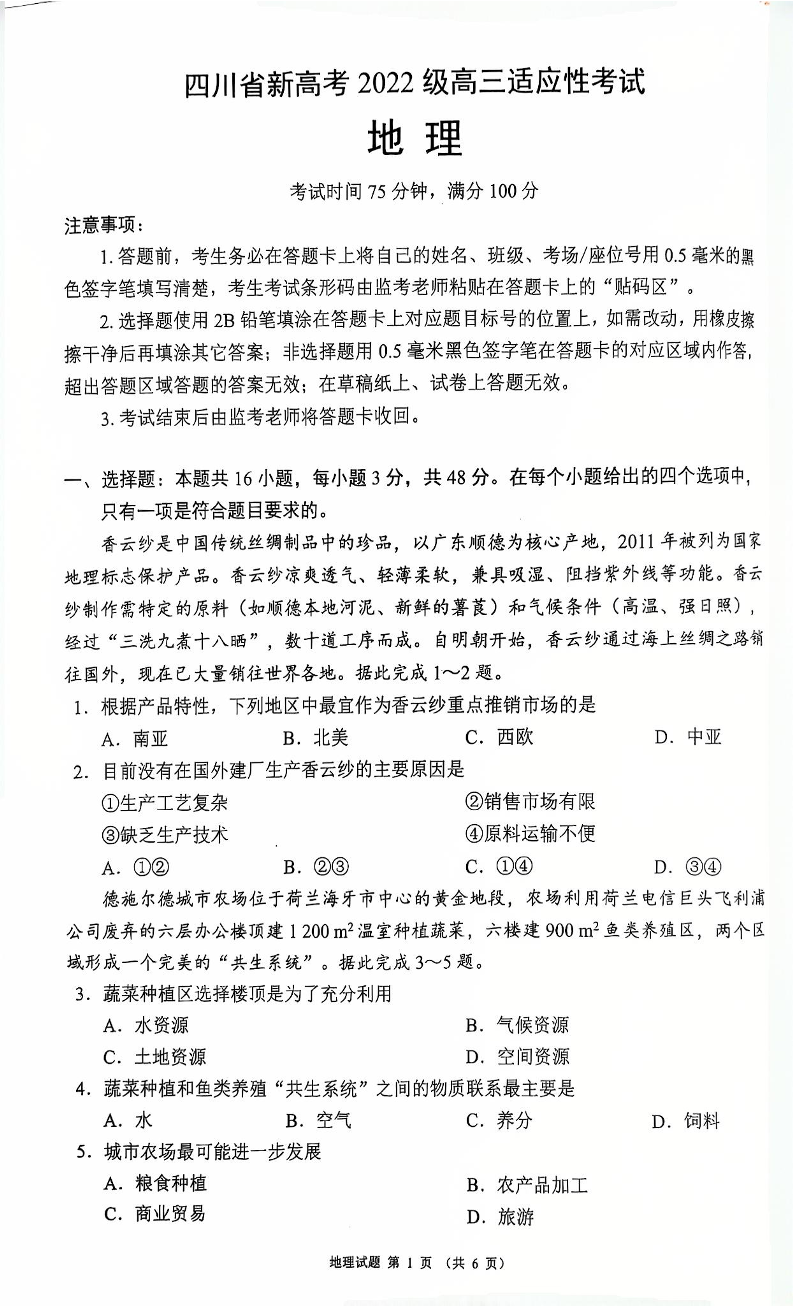 四川省(蓉城名校联盟)新高考2022级高三适应性考试 地理.pdf