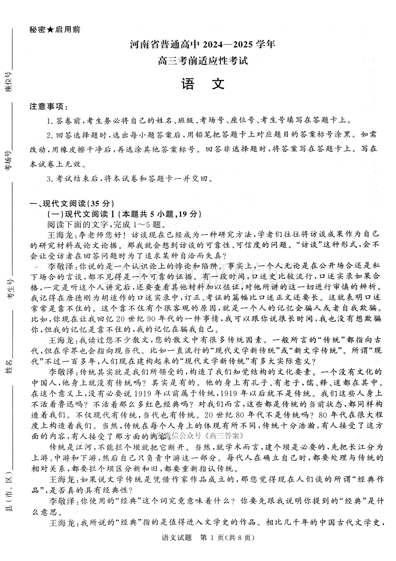 河南省普通高中2025届高三考前适应性考试 语文.pdf