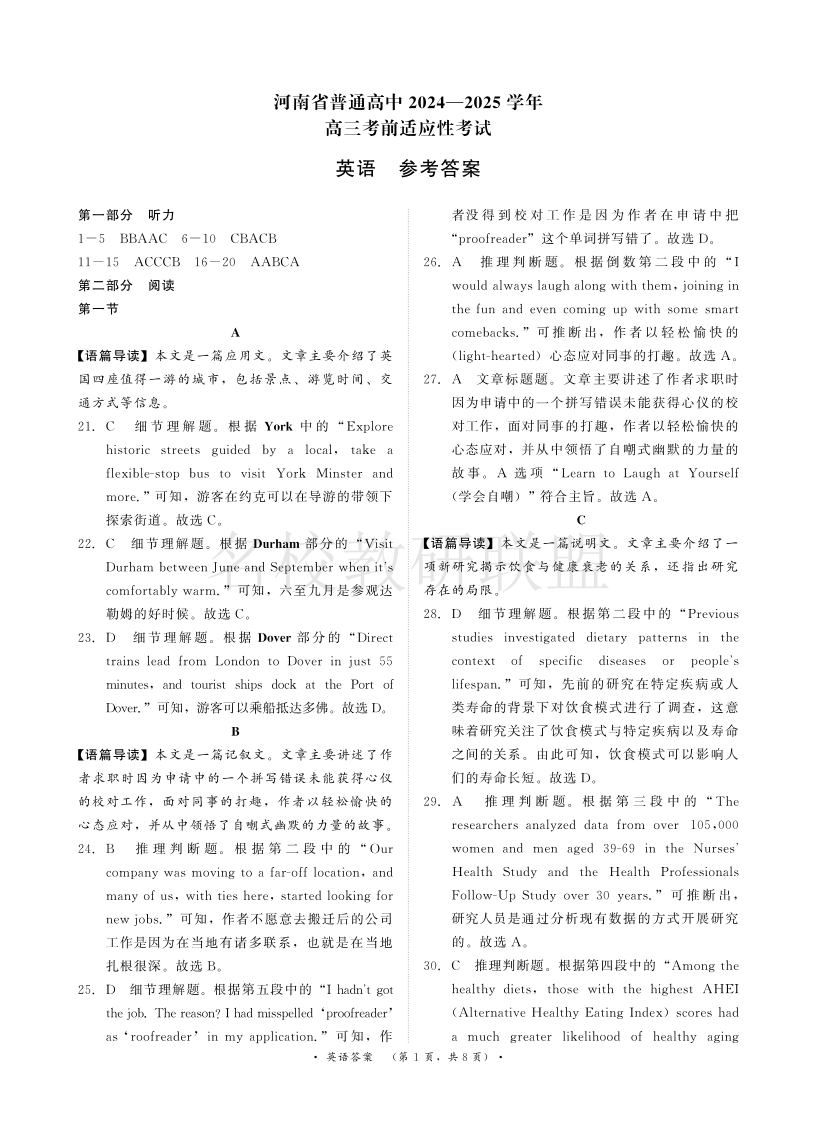 河南省普通高中2025届高三考前适应性考试 英语答案.pdf