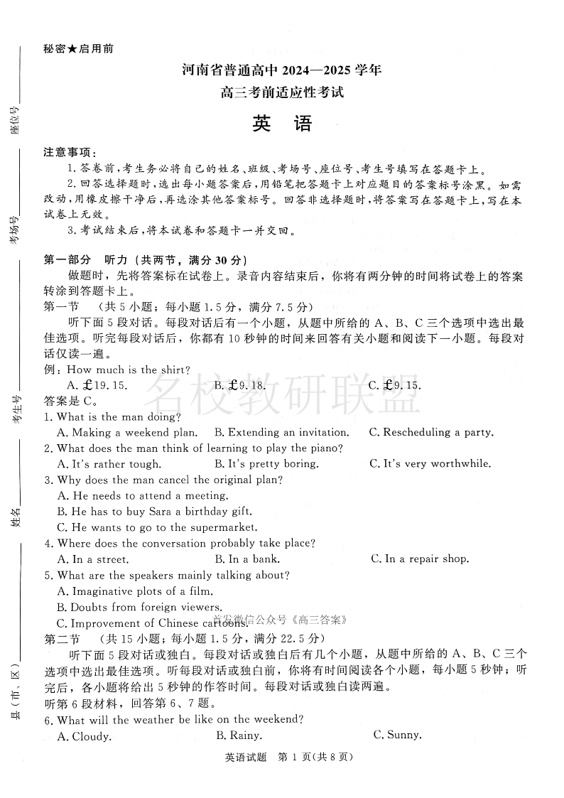 河南省普通高中2025届高三考前适应性考试 英语.pdf