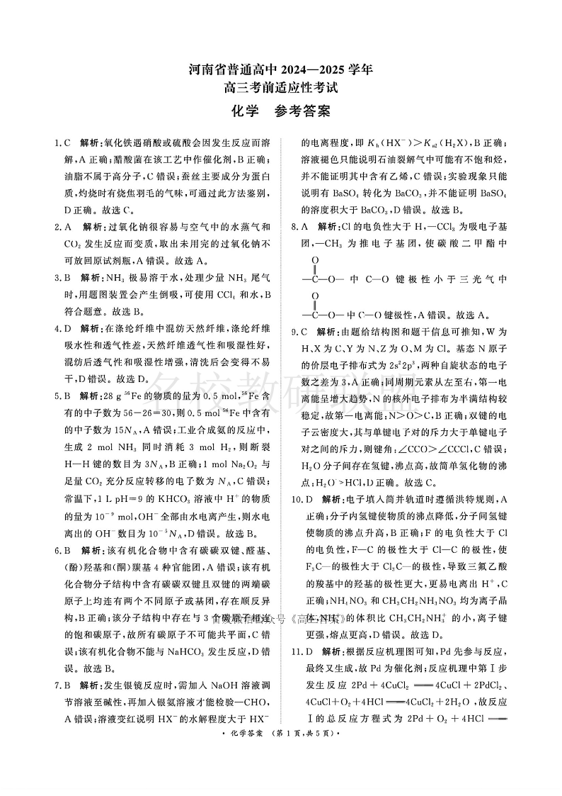 河南省普通高中2025届高三考前适应性考试 化学答案.pdf
