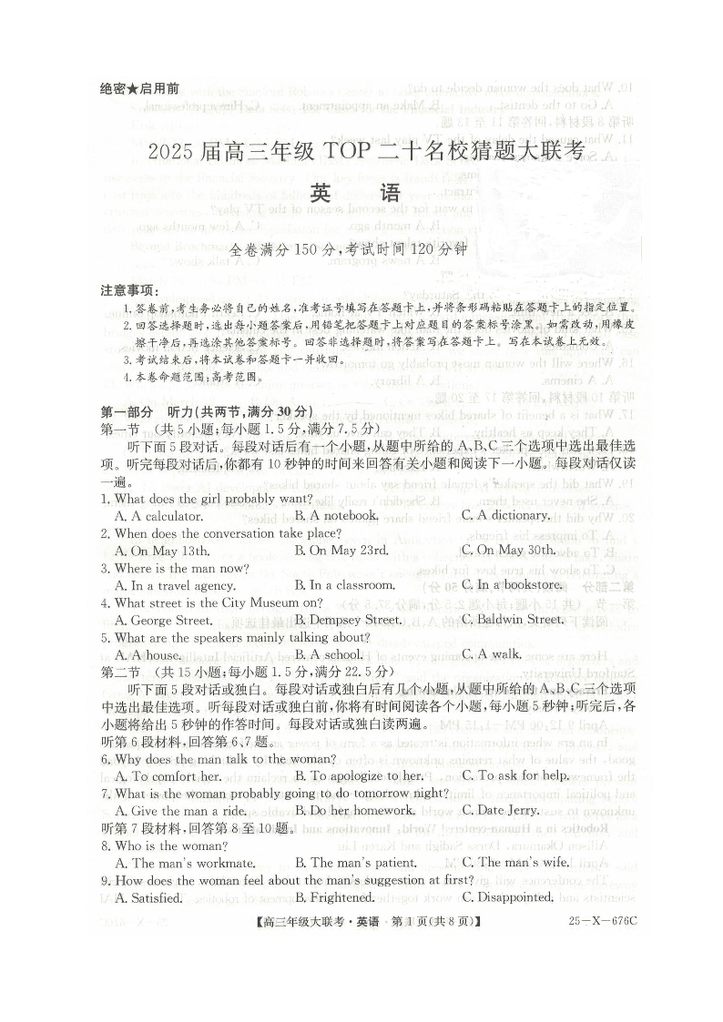 河南省2025届高三年级TOP二十名校猜题大联考 英语试题(含答案).pdf