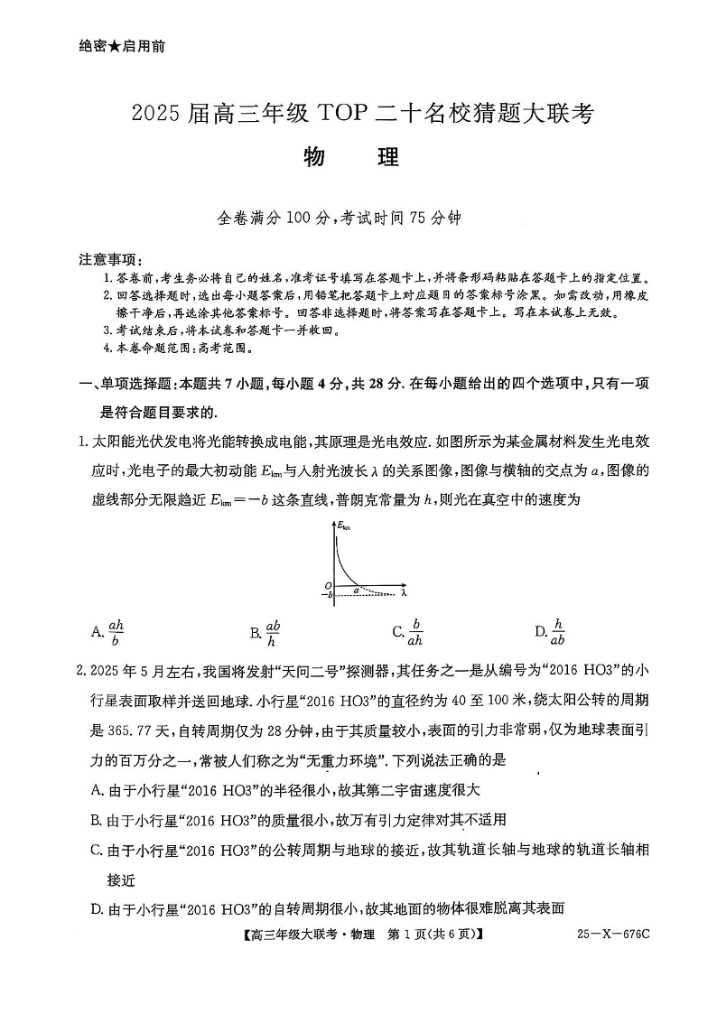 河南省2025届高三年级TOP二十名校猜题大联考 物理试题(含答案).pdf