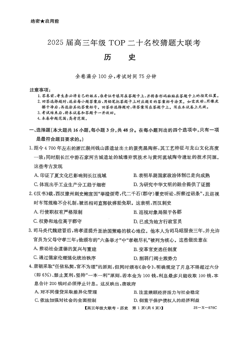 河南省2025届高三年级TOP二十名校猜题大联考 历史试题(含答案).pdf