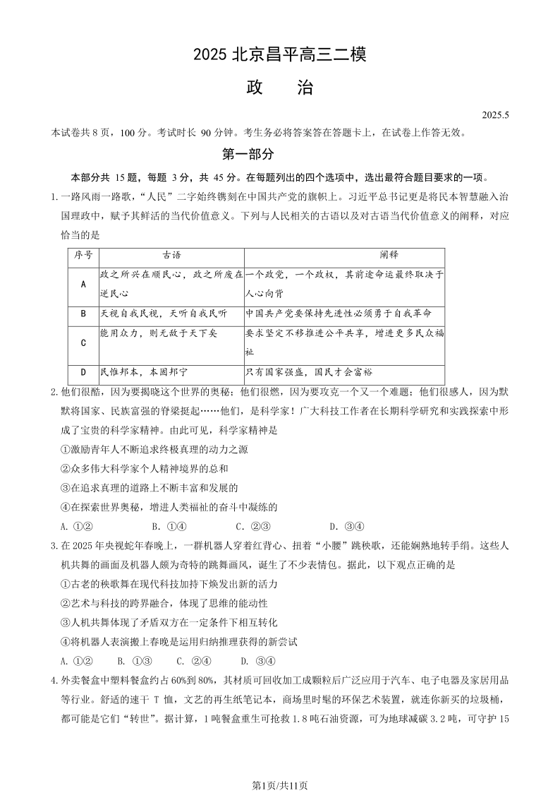 2025北京昌平高三二模 政治(含答案).pdf