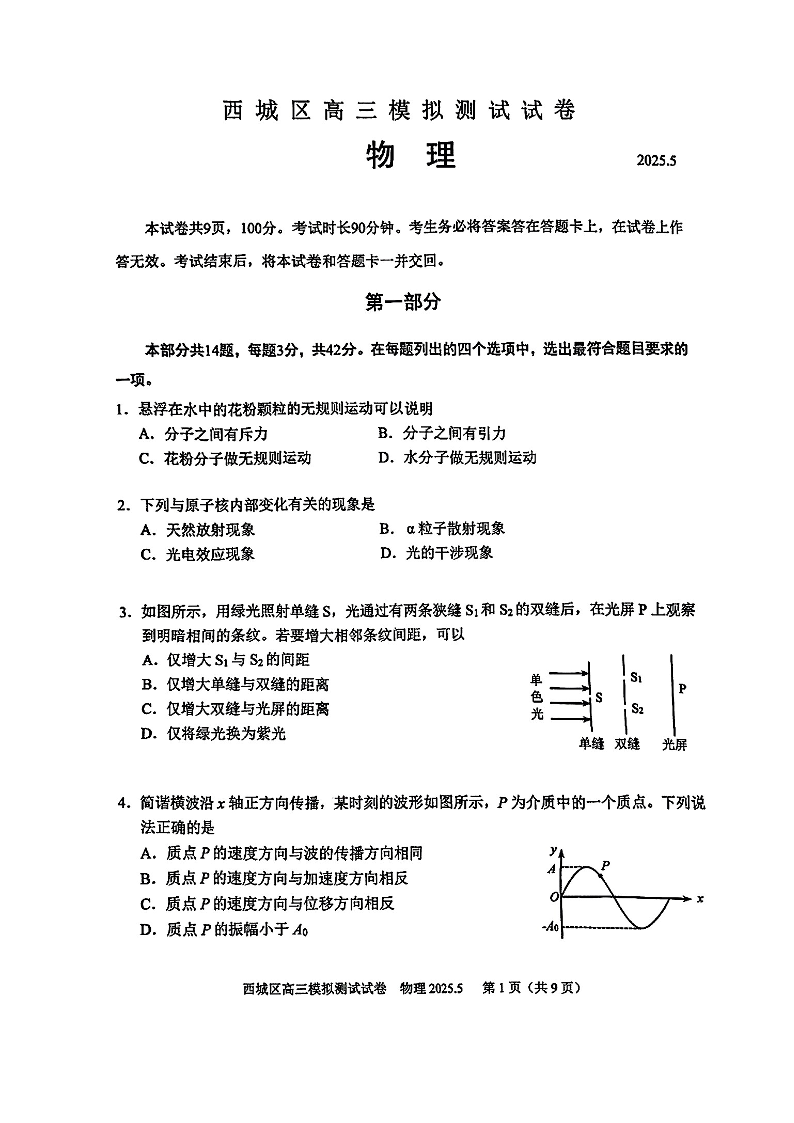 2025北京西城高三二模 物理(含答案).pdf