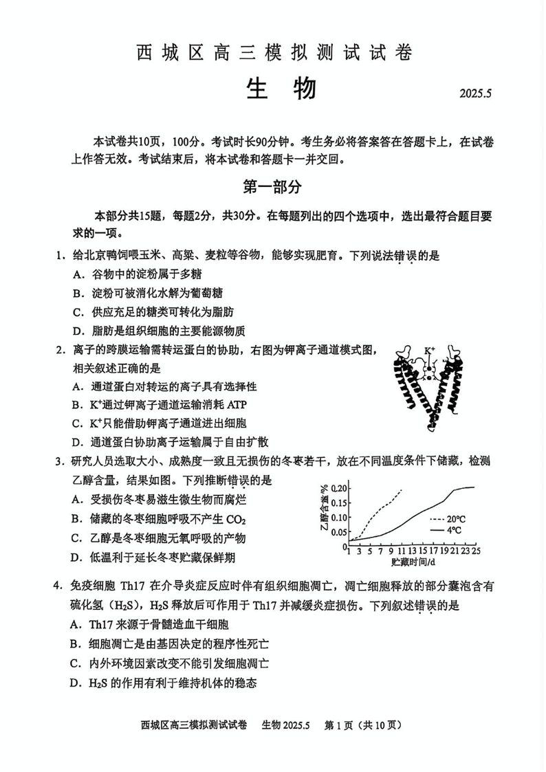 2025北京西城高三二模 生物(含答案).pdf