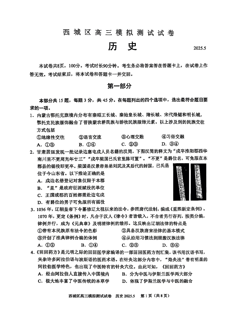 2025北京西城高三二模 历史(含答案).pdf