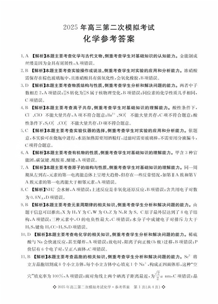 保定市2025年高三第二次模拟考试 化学答案.pdf