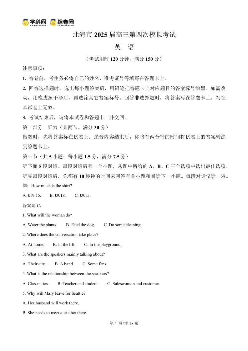 北海市2025届高三第四次模拟考试 英语(含答案).docx