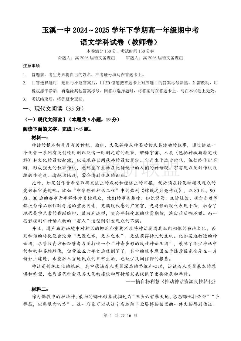 玉溪一中2024-2025学年高一下学期期中考 语文答案.pdf