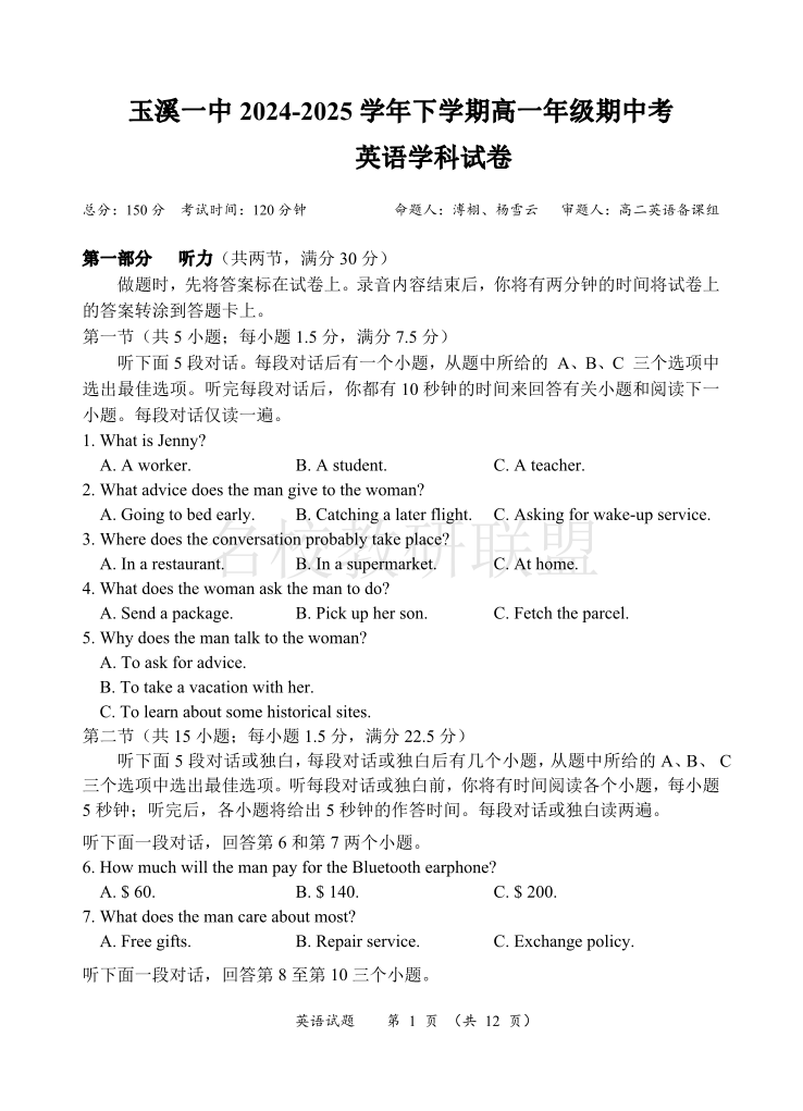 玉溪一中2024-2025学年高一下学期期中考 英语.pdf