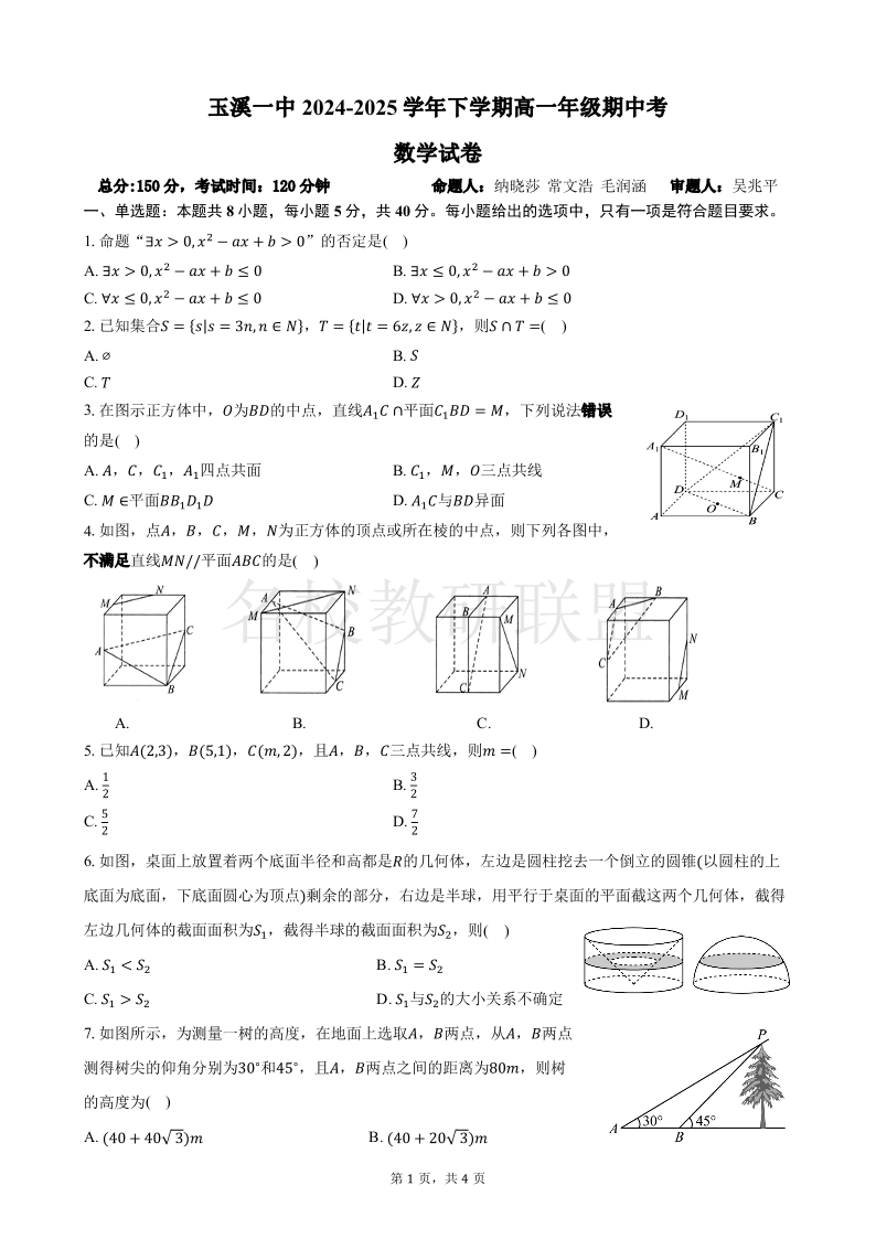 玉溪一中2024-2025学年高一下学期期中考 数学.pdf