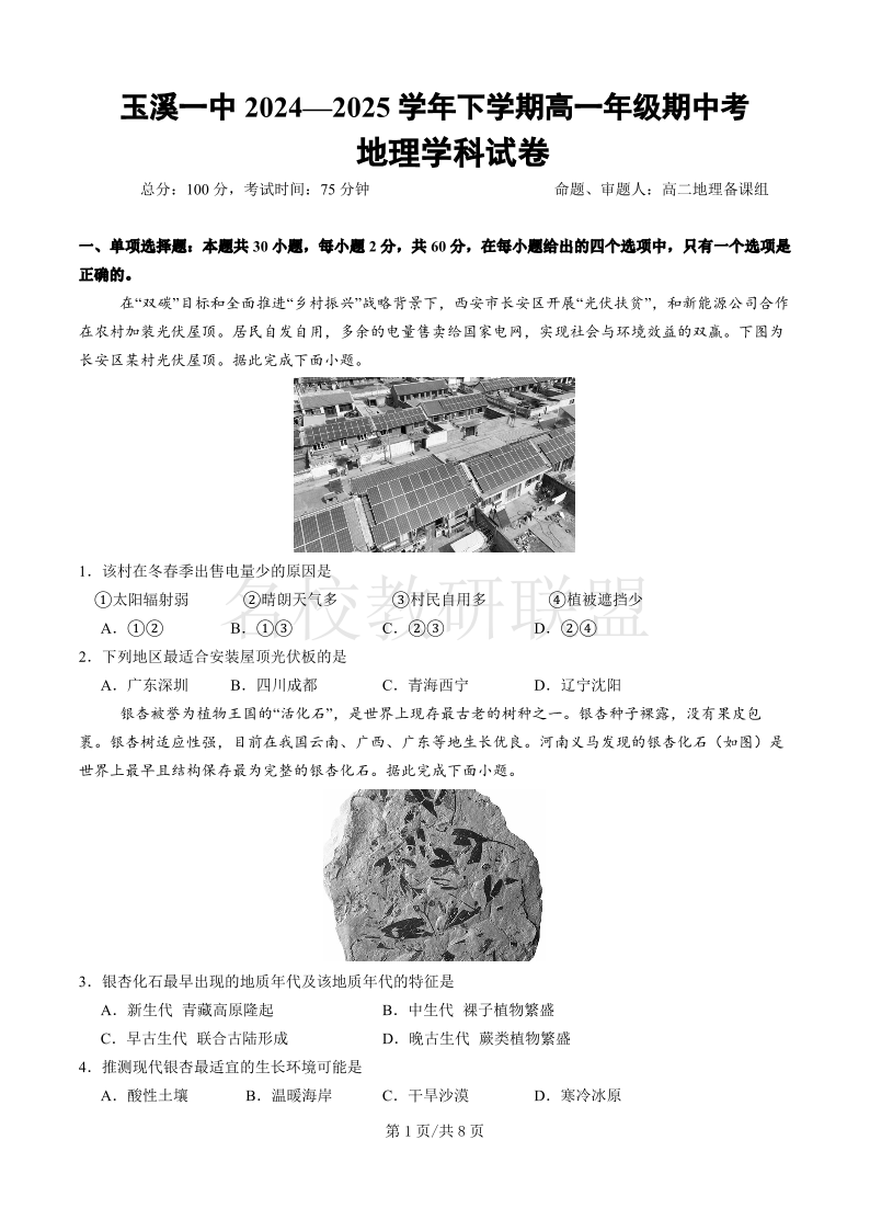 玉溪一中2024-2025学年高一下学期期中考 地理.pdf