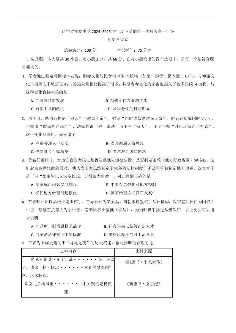 辽宁省实验中学2024-2025学年高一下学期4月阶段测试 历史(含答案).pdf