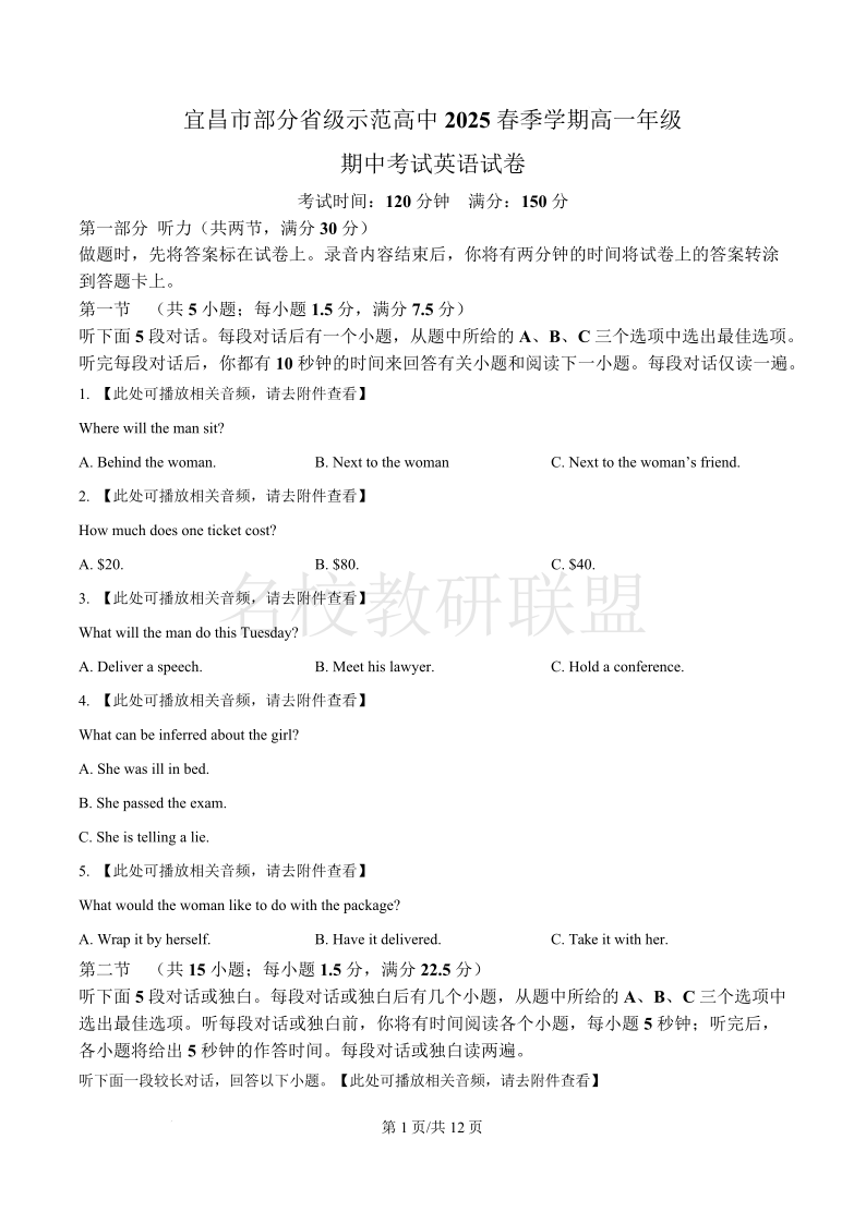 宜昌市部分省级示范高中2025春季学期高一年级期中考试 英语.pdf