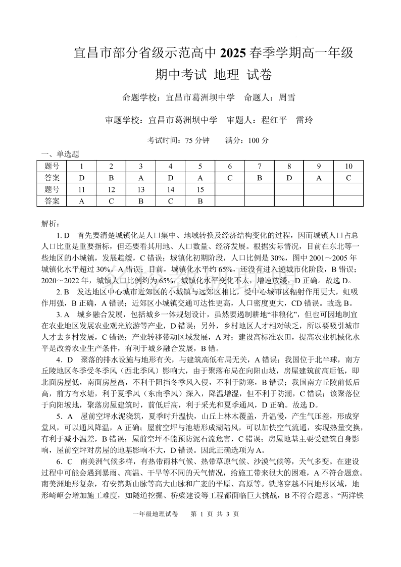 宜昌市部分省级示范高中2025春季学期高一年级期中考试 地理答案.pdf