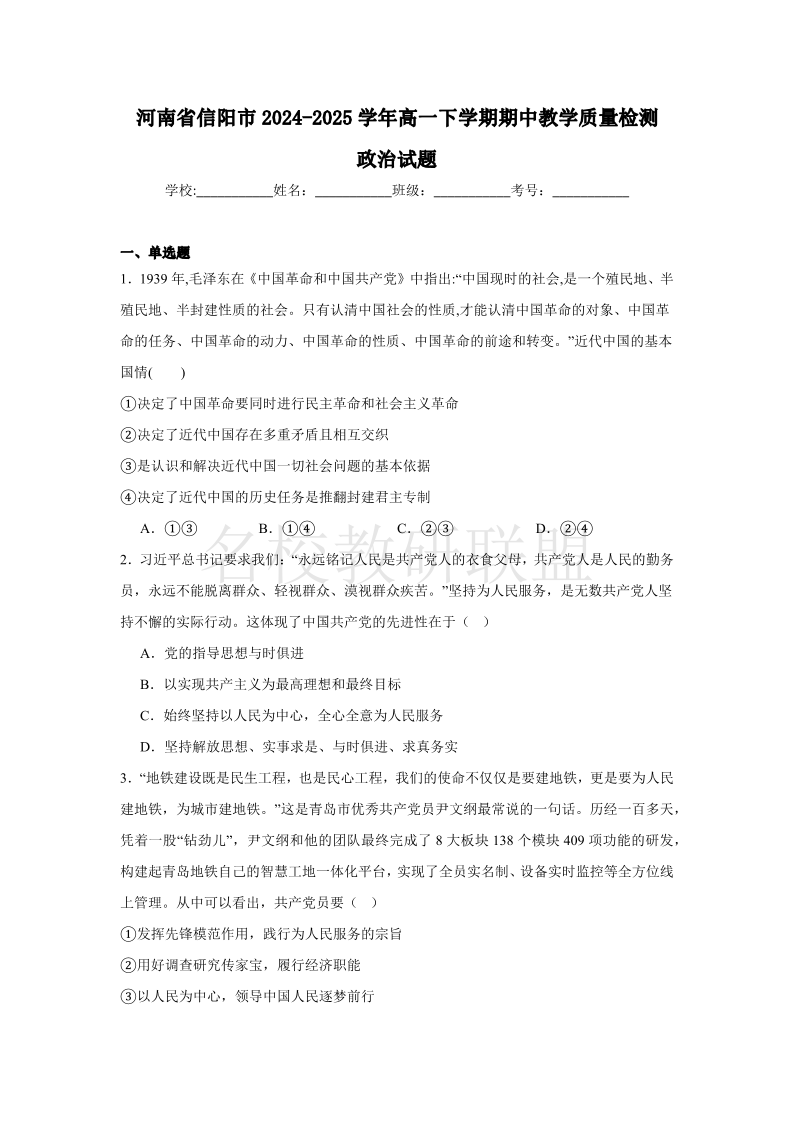 河南省信阳市2024-2025学年高一下学期4月期中考试 政治(含答案).pdf