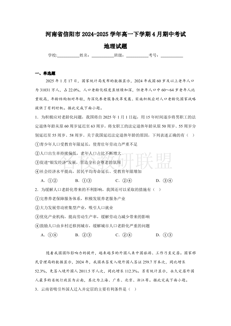 河南省信阳市2024-2025学年高一下学期4月期中考试 地理(含答案).pdf