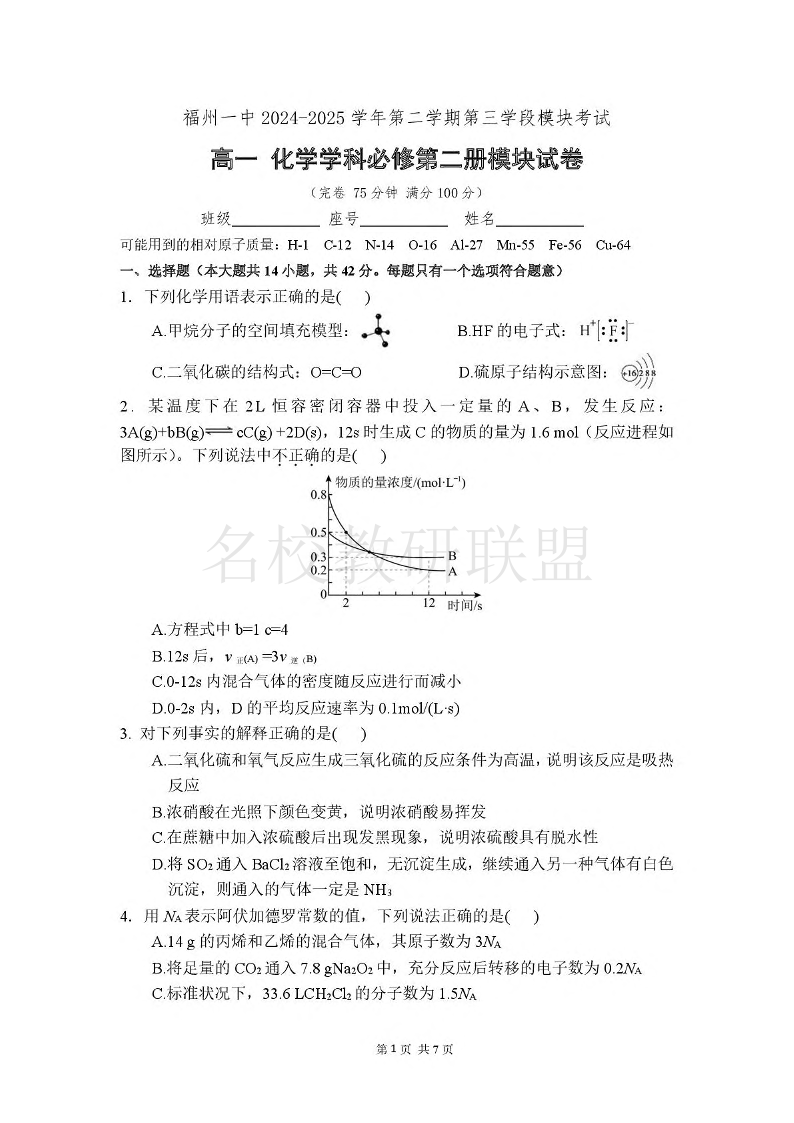 福建省福州第一中学2024-2025学年高一下学期期中考试 化学(含答案).pdf