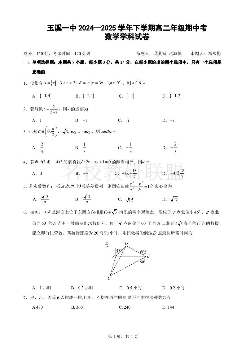 玉溪一中2024-2025学年高二下学期期中考 数学.pdf