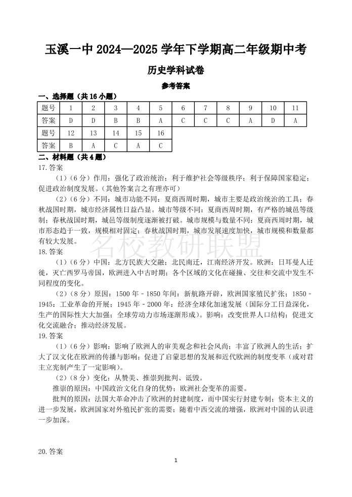玉溪一中2024-2025学年高二下学期期中考 历史答案.pdf