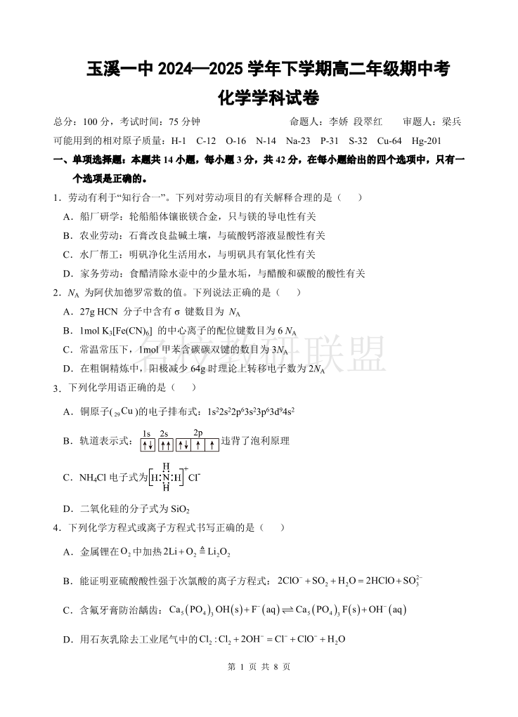 玉溪一中2024-2025学年高二下学期期中考 化学.pdf