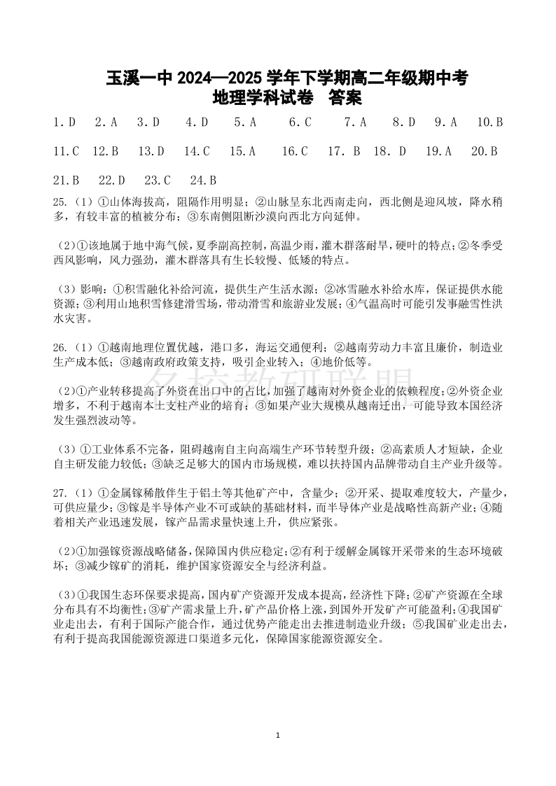 玉溪一中2024-2025学年高二下学期期中考 地理答案.pdf