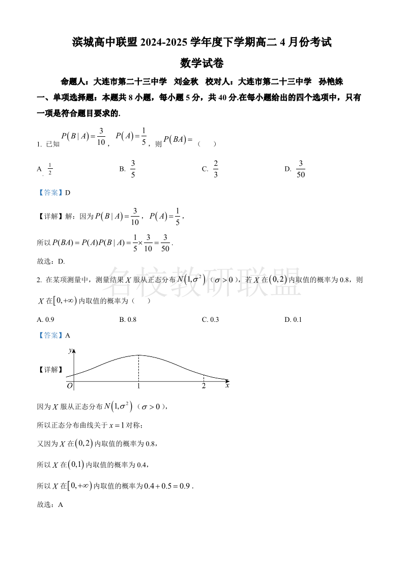 辽宁省大连市滨城高中联盟2024-2025学年高二下学期4月考试 数学试卷(含答案).pdf
