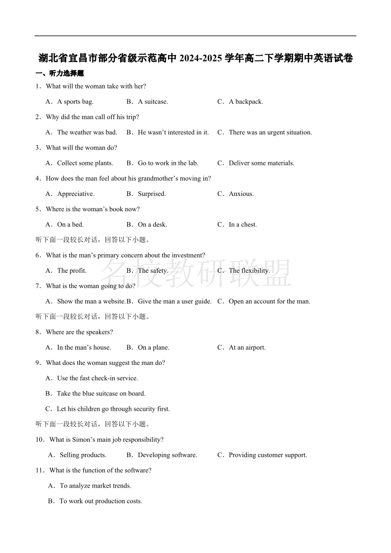 宜昌市部分省级示范高中2025春季学期高二年级期中考试 英语试卷(含答案).pdf