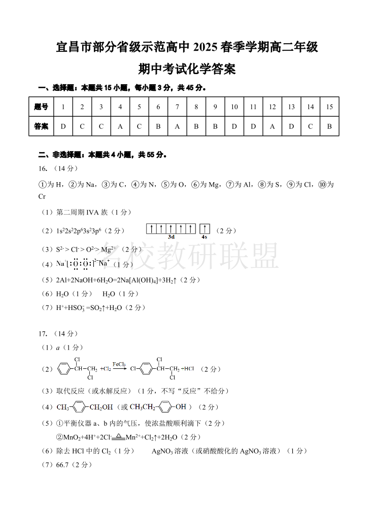 宜昌市部分省级示范高中2025春季学期高二年级期中考试 化学答案.pdf