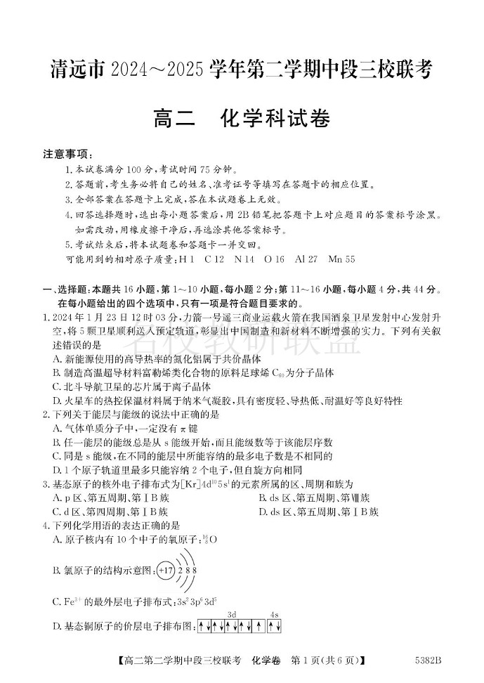 广东省清远市三校2024-2025学年高二下学期期中联考试题 化学试题(含答案).pdf