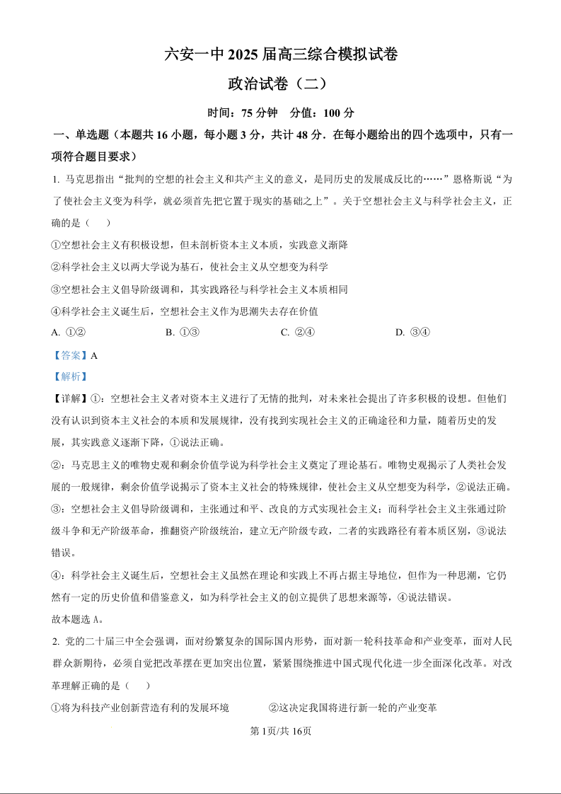 安徽省六安第一中学2025届高三下学期模拟预测(二)政治答案.docx