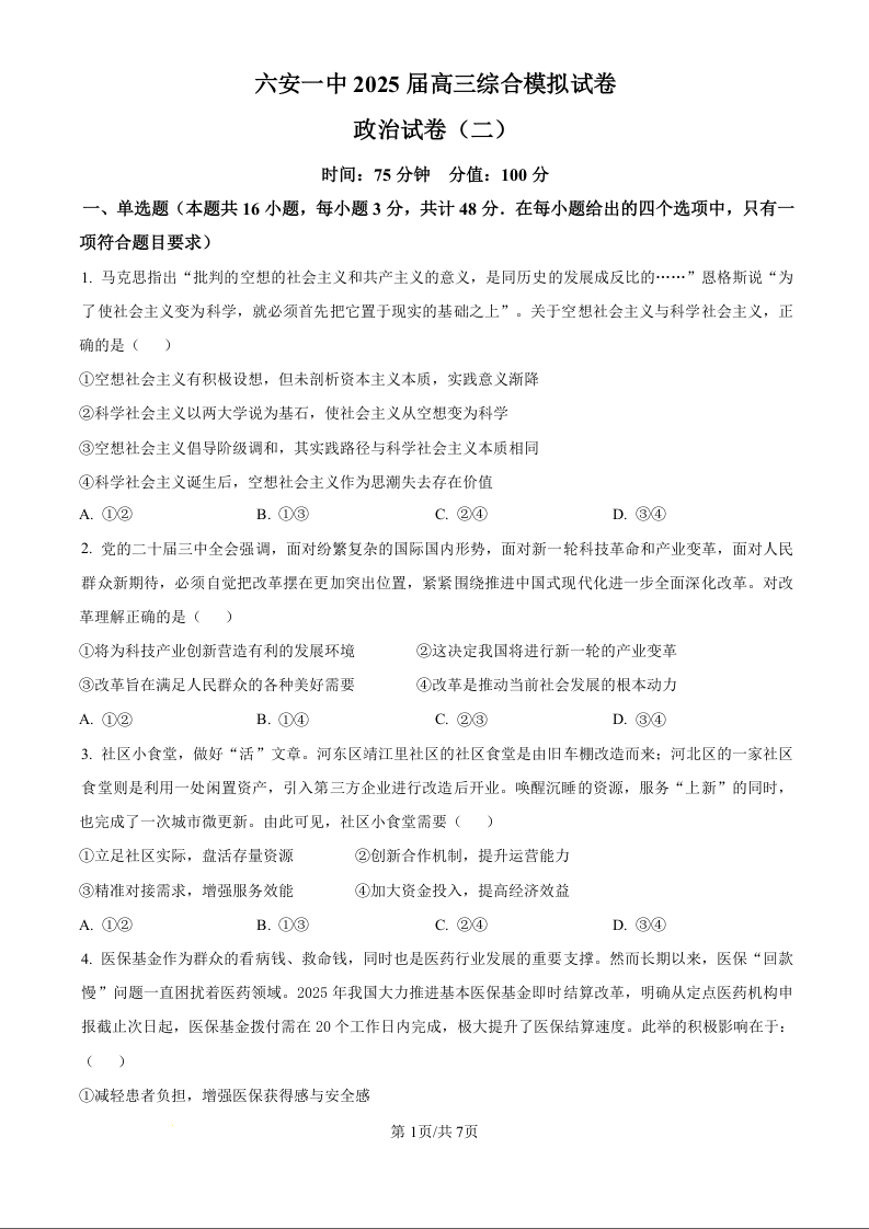 安徽省六安第一中学2025届高三下学期模拟预测(二)政治.docx