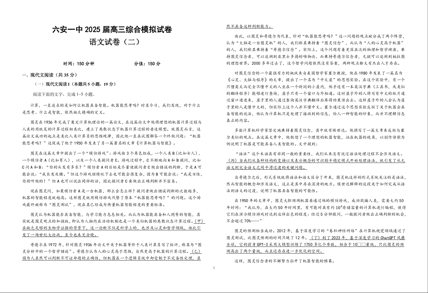 安徽省六安第一中学2025届高三下学期模拟预测(二)语文(含答案).docx