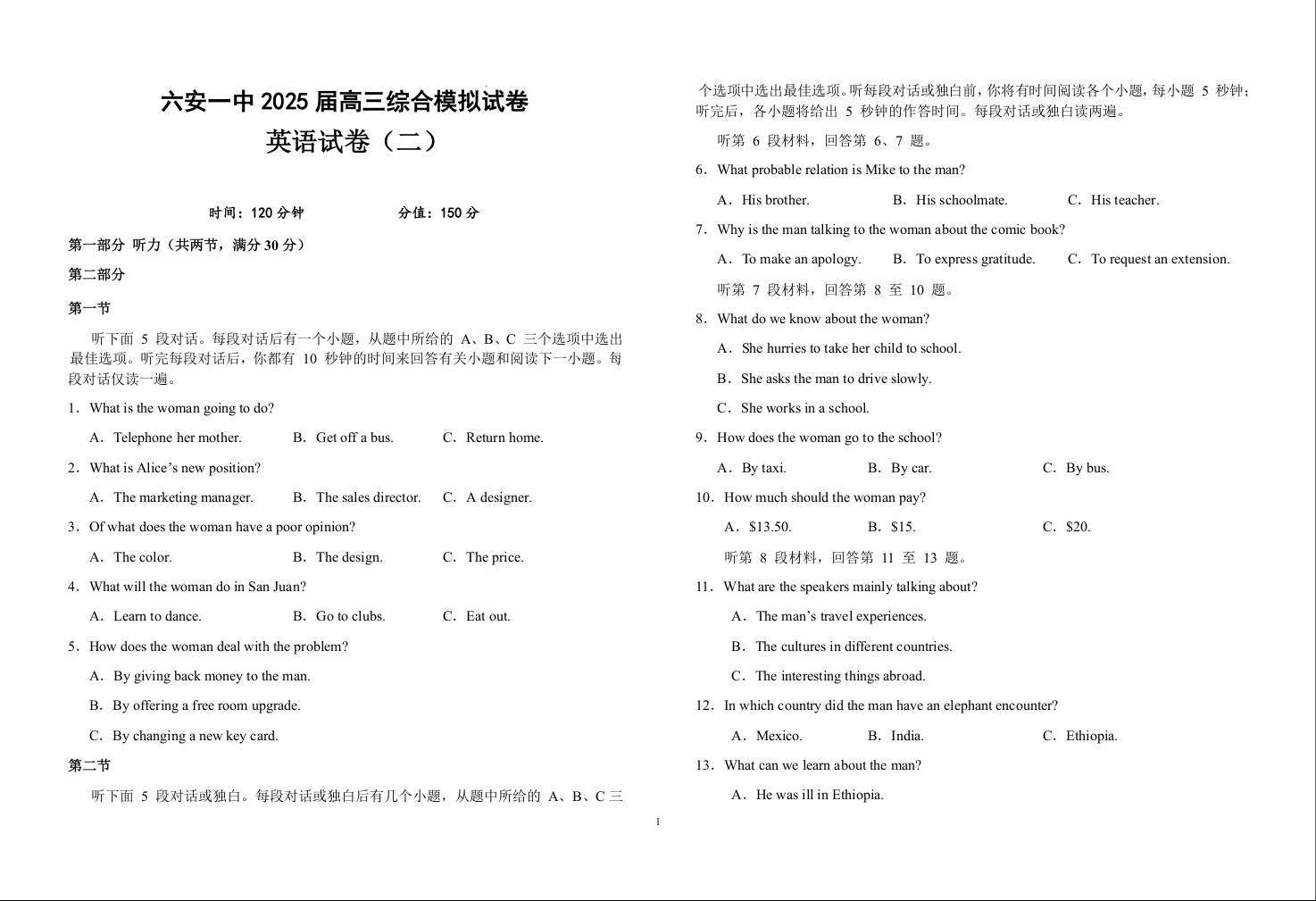 安徽省六安第一中学2025届高三下学期模拟预测(二)英语(含答案).docx