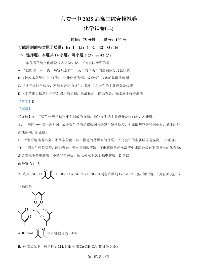 安徽省六安第一中学2025届高三下学期模拟预测(二)化学答案.docx