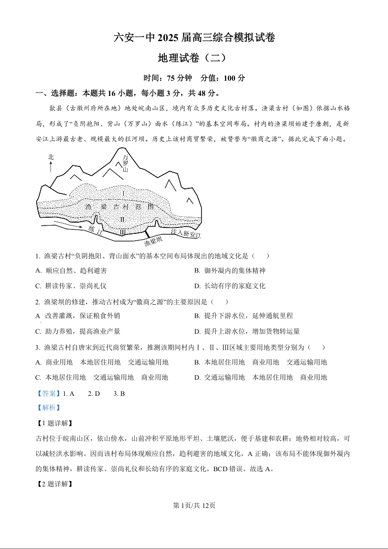 安徽省六安第一中学2025届高三下学期模拟预测(二)地理答案.docx
