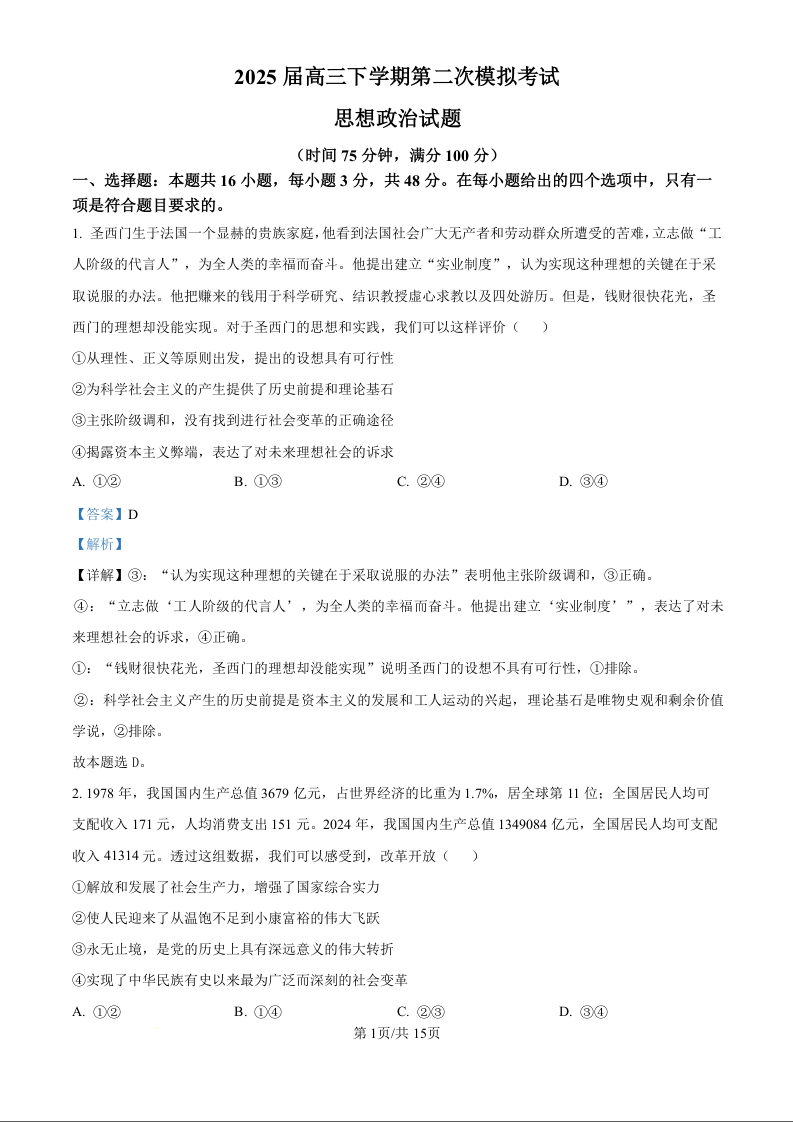 河北省邢台市五县一中2025届高三下学期第二次模拟考试 政治答案.docx