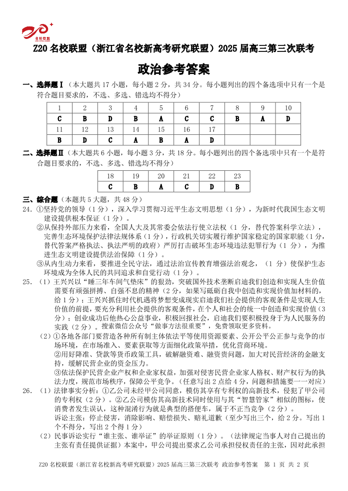 浙江Z20名校联盟2025届高三第三次联考-政治答案.pdf