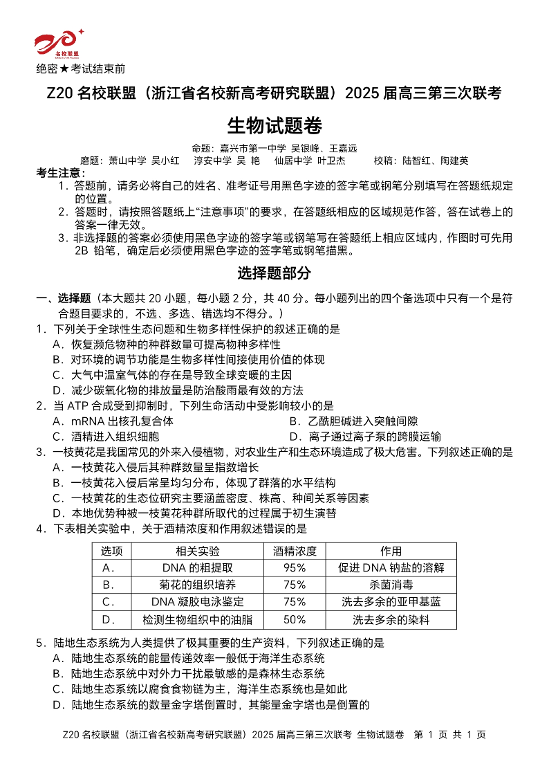 浙江Z20名校联盟2025届高三第三次联考-生物.pdf