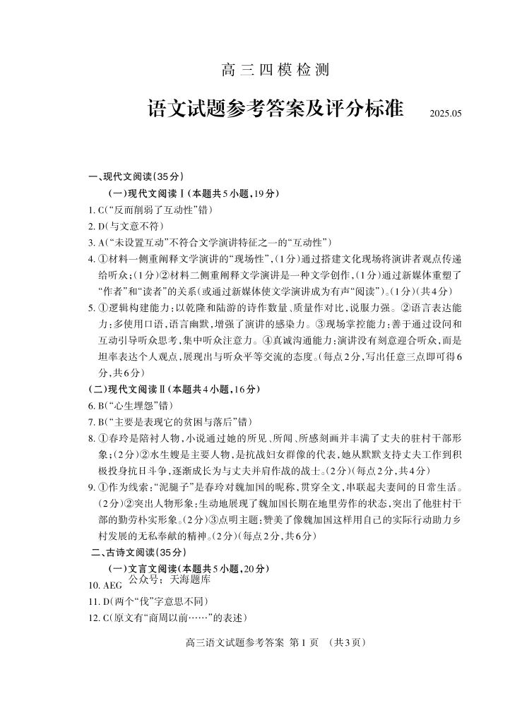 山东省泰安市2025届高三四模检测 语文答案.pdf