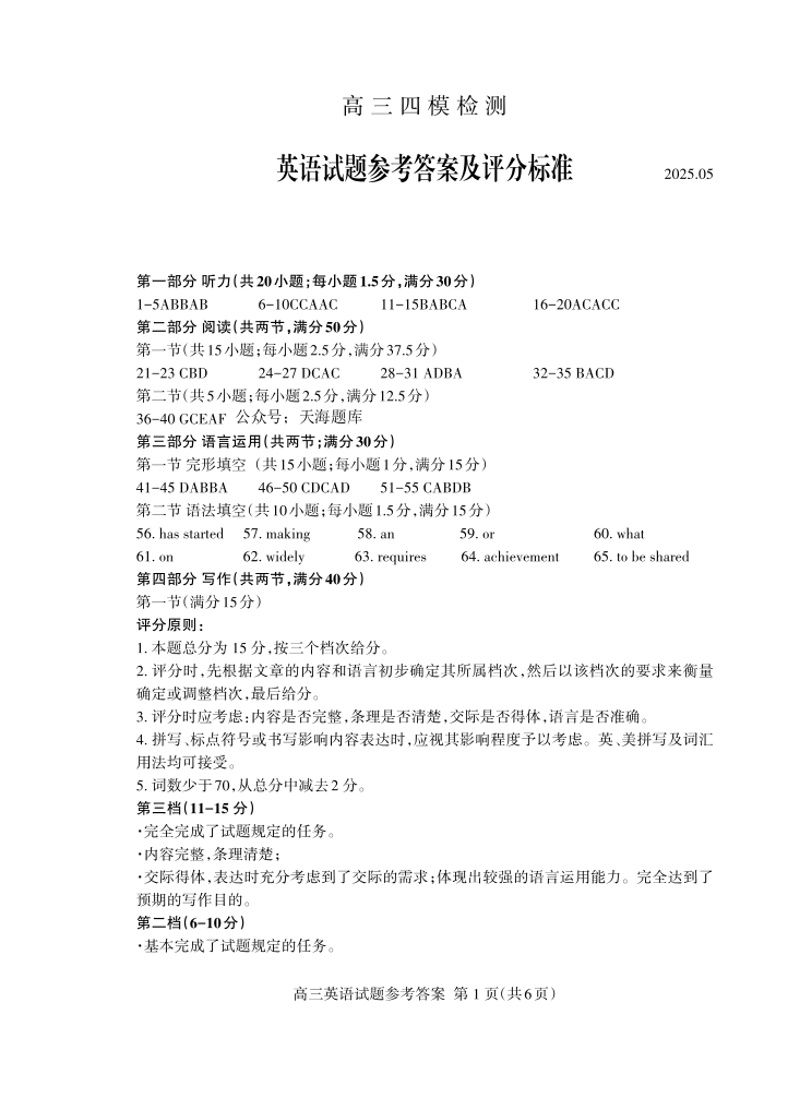 山东省泰安市2025届高三四模检测 英语答案.pdf