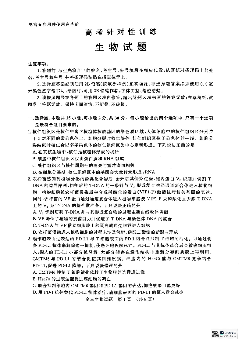 山东省济南市2025年5月高考针对性训练 生物.pdf