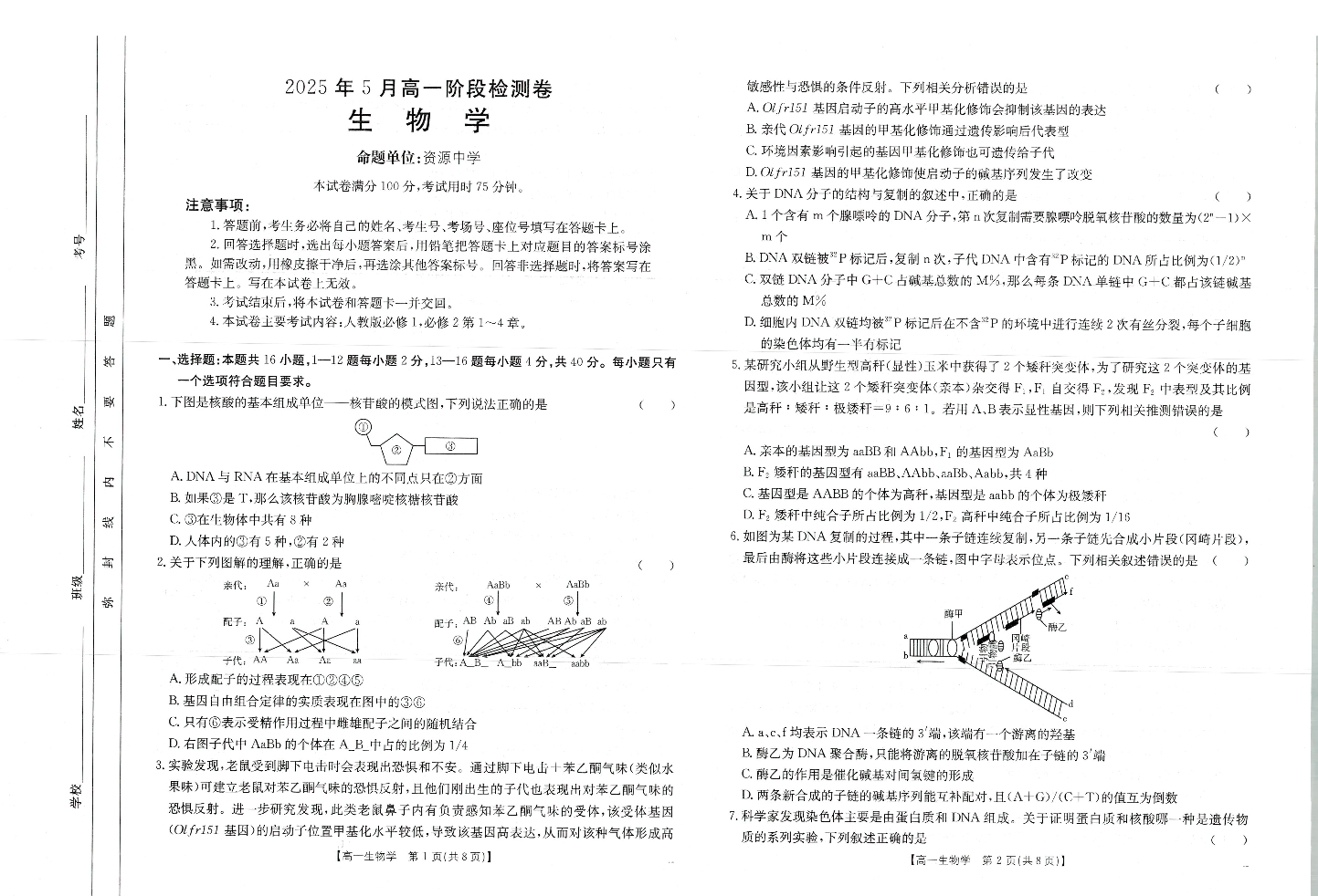 桂林2025年5月高一联考生物试卷(含答案).pdf