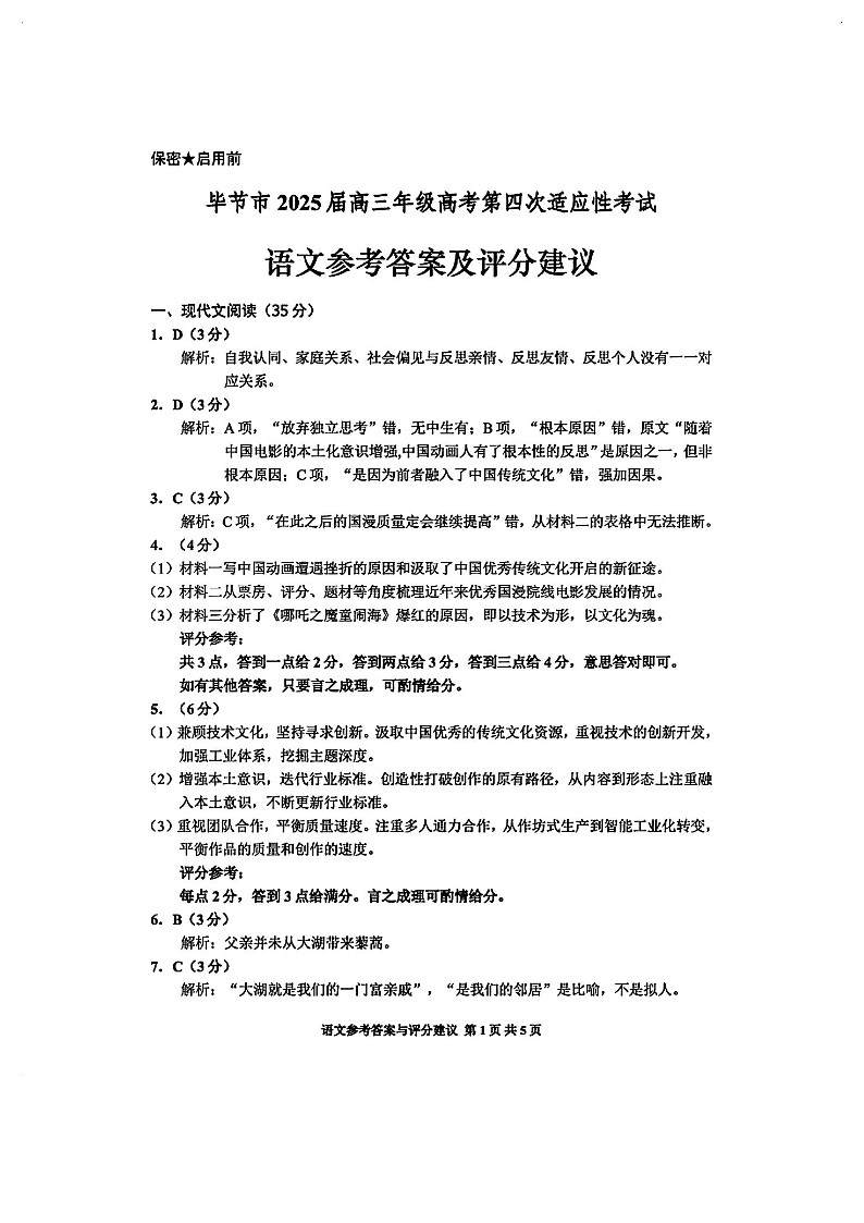 贵州省毕节市2025届高三年级高考第四次适应性考试 语文答案.pdf